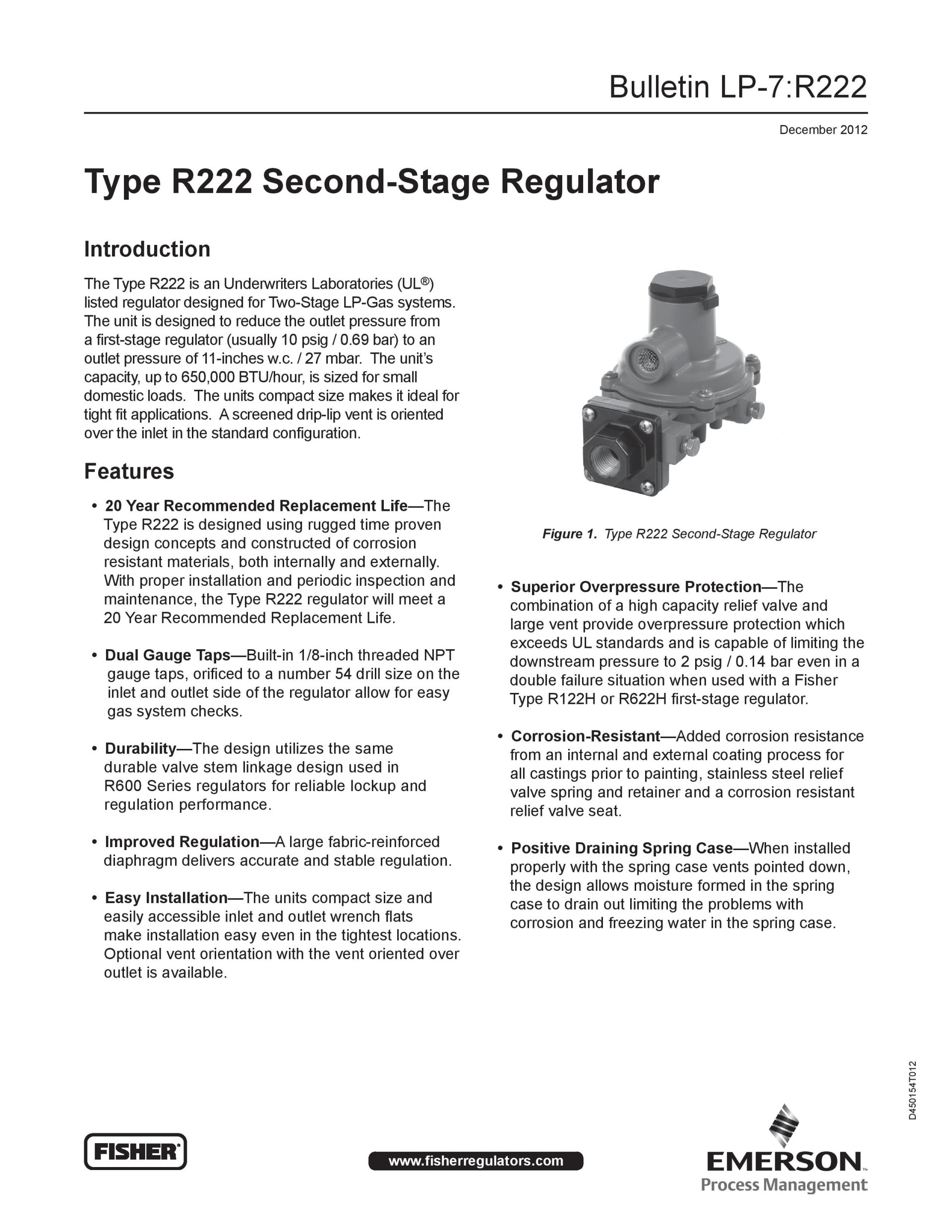 The Fisher Type R222 is a UL®-listed second-stage regulator designed for use in two-stage LP-Gas systems. Its primary function is to reduce the outlet pressure from a first-stage regulator—typically 10 psig (0.69 bar)—to a consistent downstream pressure of 11 inches w.c. / 27 mbar.