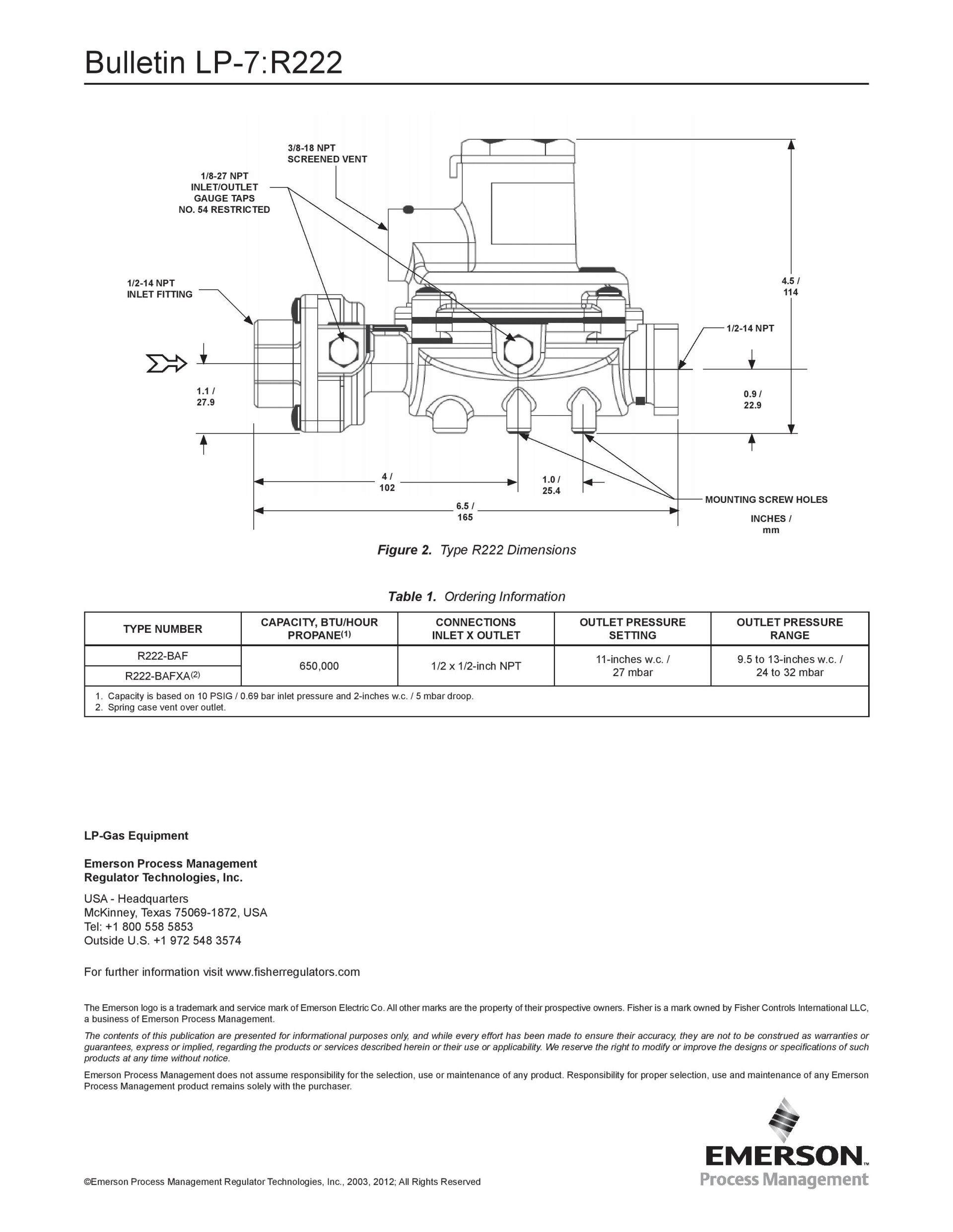 • Equipped with a high-capacity relief valve and large vent, the R222 provides protection that exceeds UL standards. It can limit downstream pressure to 2 psig (0.14 bar), even during dual failure scenarios when used with Fisher Type R122H or R622H first-stage regulators.
